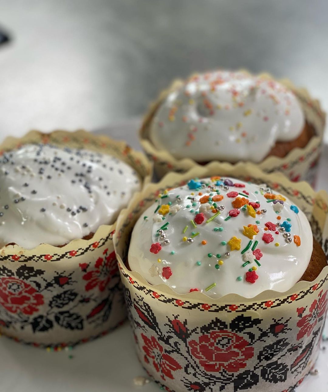 Готовое тесто разложить по формочкам, чуть больше чем до половины, и выпекать при температуре 180 градусов 40-45 минут. Остывшие паски украсить глазурью и пищевой посыпкой, на свой вкус.