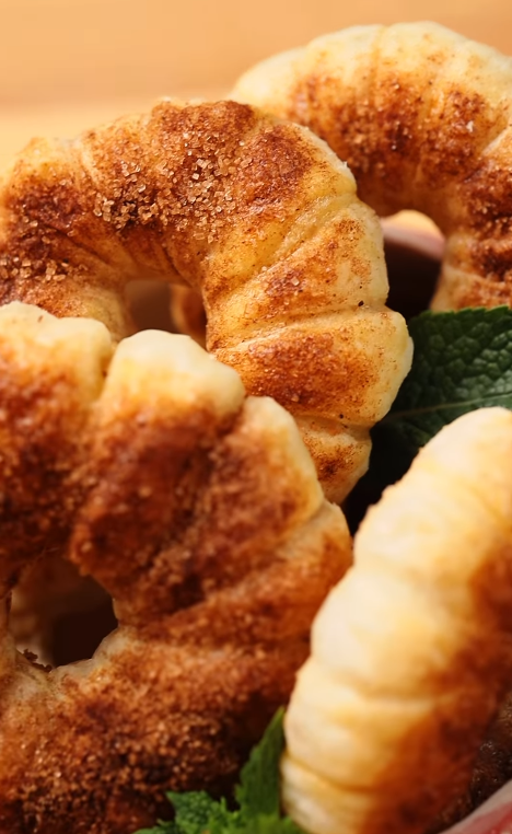 3. Заворачиваем яблочные кольца в тесто, смазываем желтком, посыпаем сахаром и корицей.