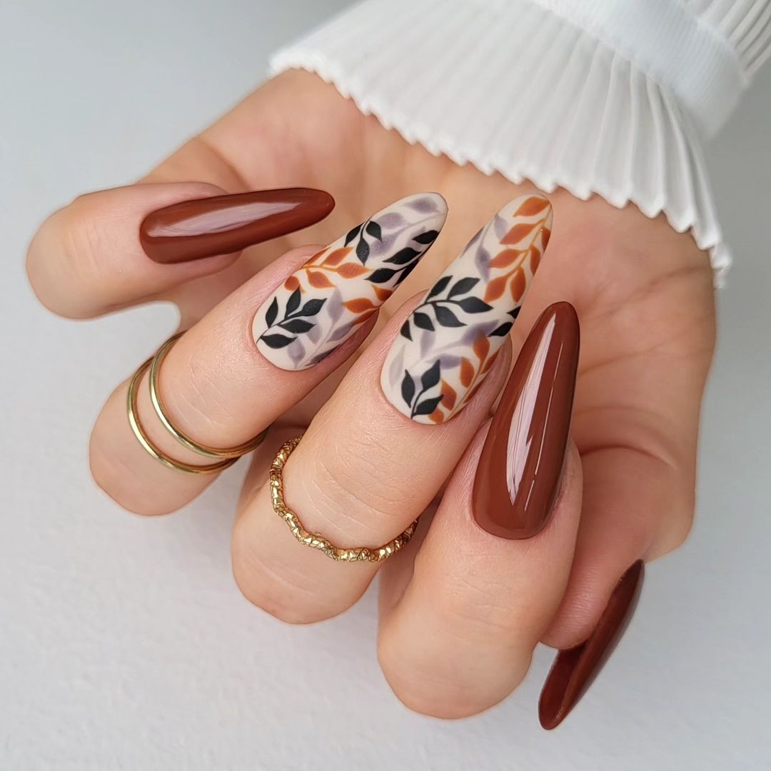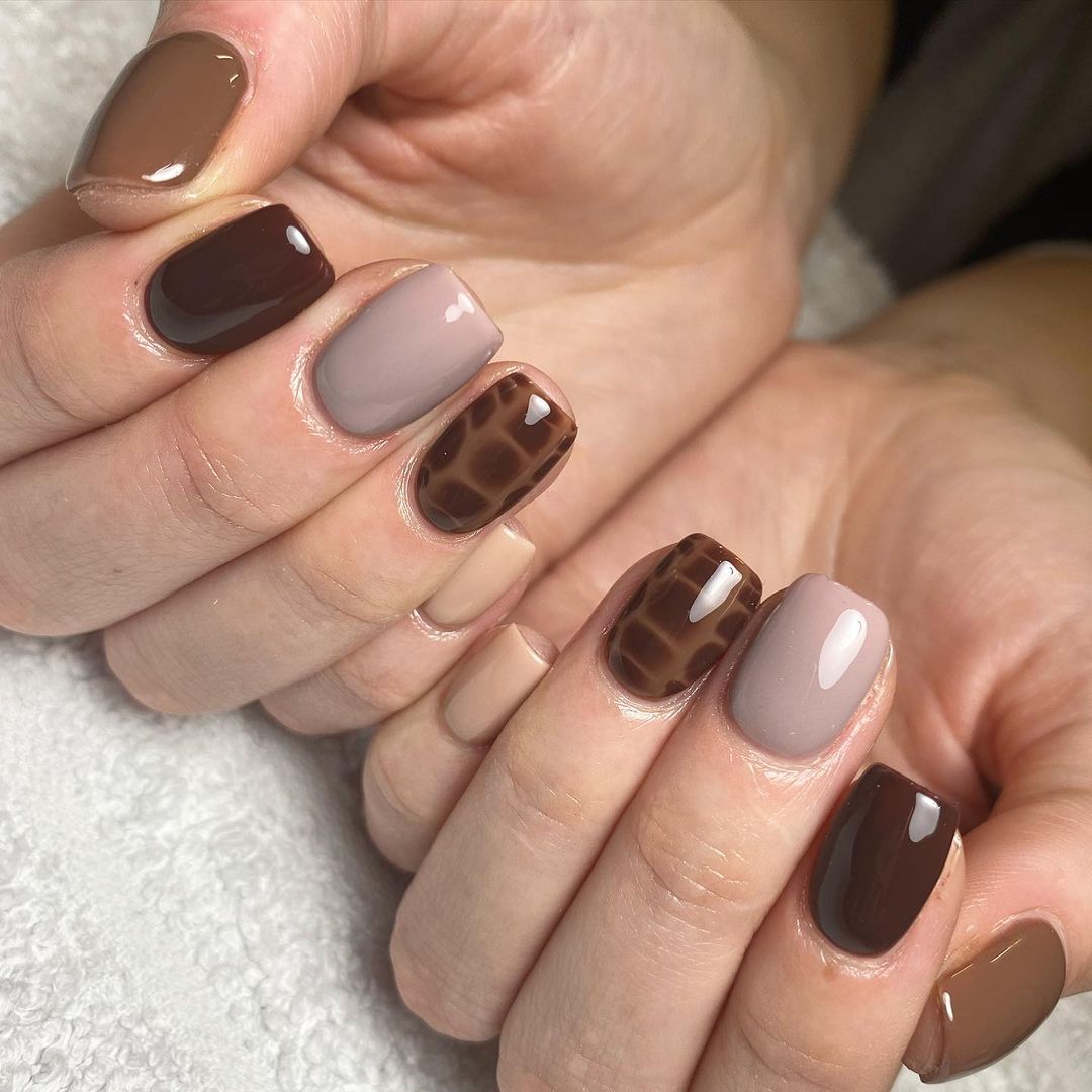 Маникюр в коричневых тонах - классический выбор на осень. Красота коричневого цвета заключается в его универсальности, позволяющей сочетать его с другими оттенками, а также украшать золотистыми элементами, цветочным или анималистичным декором. Независимо от того, предпочитаете ли вы носить длинные ногти или выбираете естественную длину, коричневые ногти легко дополнят атмосферу осени.
