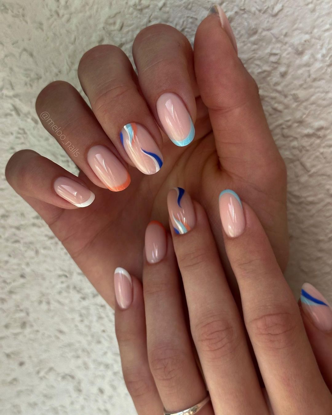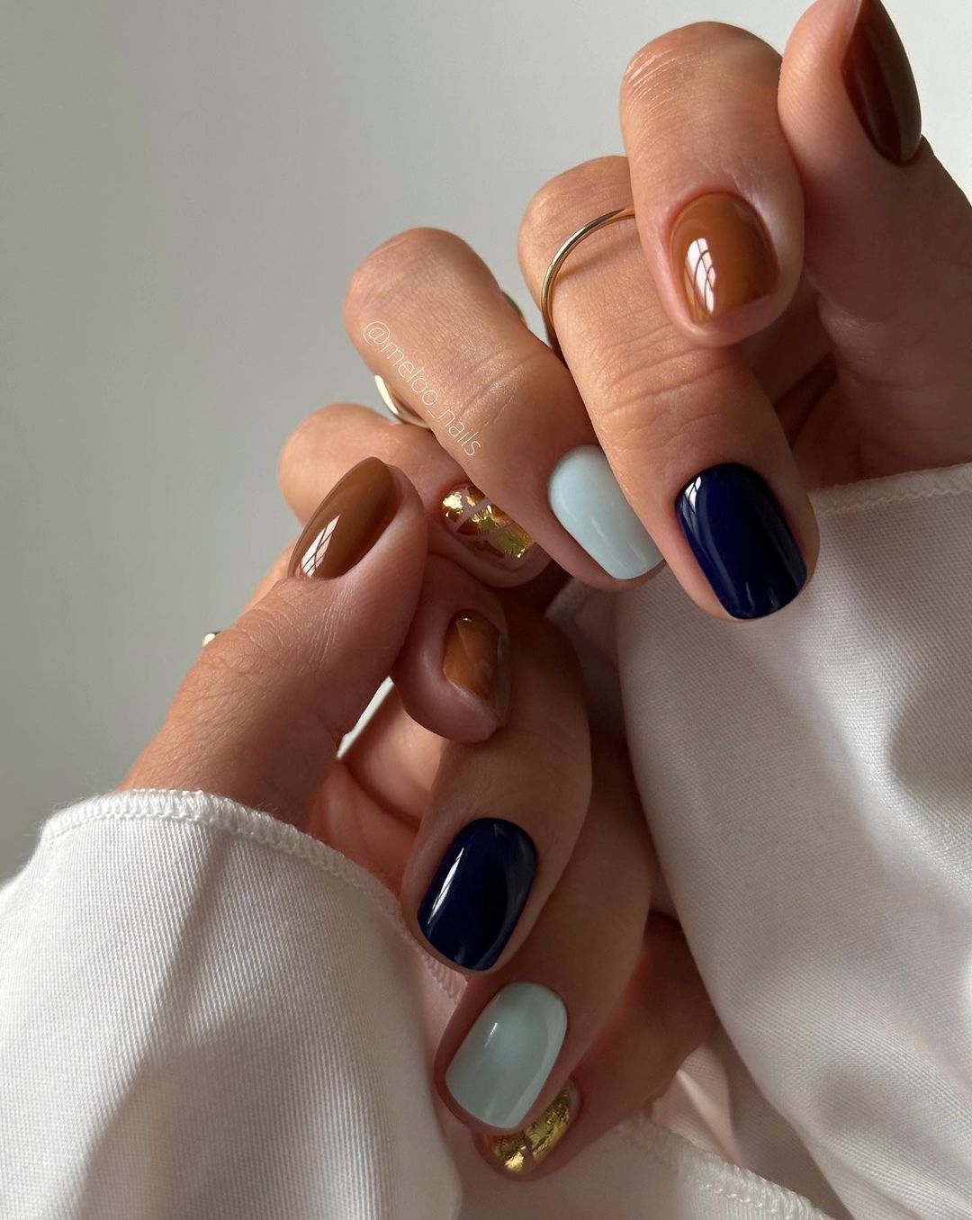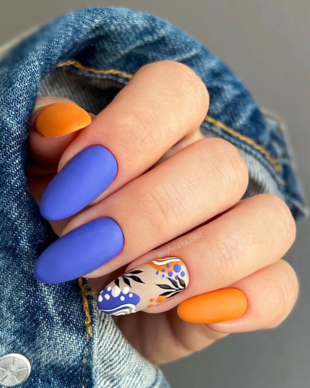 Оранжевый цвет у многих ассоциируется с осенью, поэтому так популярен в осеннем маникюре. В 2023 году нейл-арт мастера предлагают дополнять его другими оттенками. Классическим сочетанием считается оранжевый с синим - контраст теплого и холодного цветов эффектно смотрится на ногтях.
