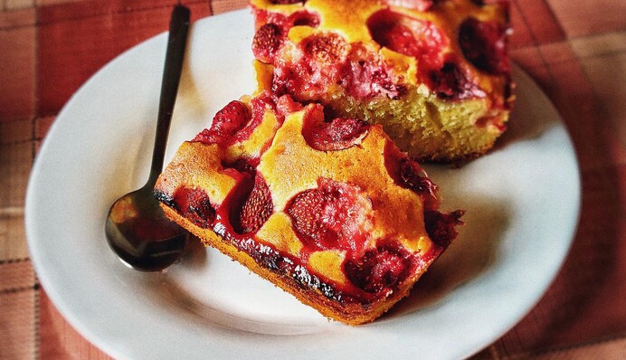 Ингредиенты: яйца (2 шт.), сахар (90 г), ванильный сахар (10 г), йогурт без добавок (200 г), растительное масло (120 г), разрыхлитель (10 г), мука (220 г), клубника (400 г), крахмал (1 ст. л.).