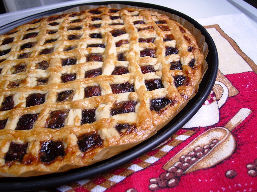 Затем выкладываем на него варенье и равномерно распределяем его по всей поверхности. Отложенный кусочек теста (тот, что поменьше), раскатываем не сильно тонко и нарезаем аккуратными полосками. Выкладываем их в виде решетки на пирог поверх варенья. Формируем из полосок края бортиков.