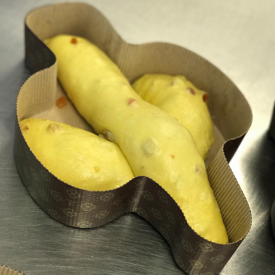 После этого добавляем последние 50 г растопленного сливочного масла в тесто, а также цукаты. Снова вымешиваем тесто около 10-15 минут, затем выкладываем его в форму в виде голубя.
