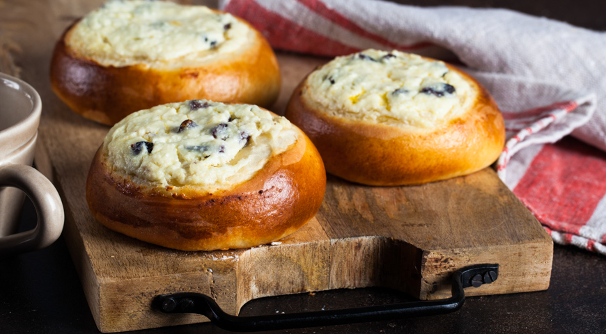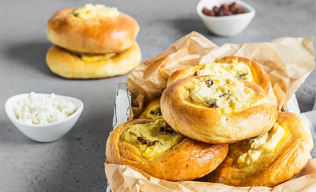 Ингредиенты: молоко (250 мл), сахар (4 ст. л.), сухие дрожжи (2 ч. л.), мука (500 г), куриные яйца (3 шт.), соль (0,5 ч. л.), разрыхлитель (10 г), сливочное масло (30 г), растительное масло (1 ст. л.), творог (400 г), ванильный сахар (1 ч. л.), изюм (2 ст. л.).