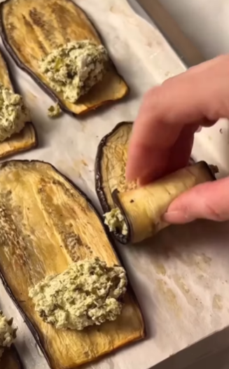 8. На запеченные баклажаны выложите начинку из сыра и зелени, сверните их в рулетики.