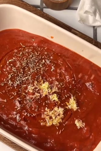 6. В форму, где будут запекаться рулетики из баклажанов, влейте пюре из свежих помидоров или томатную пасту, добавьте сушеные травы и оливковое масло. Все тщательно перемешайте.