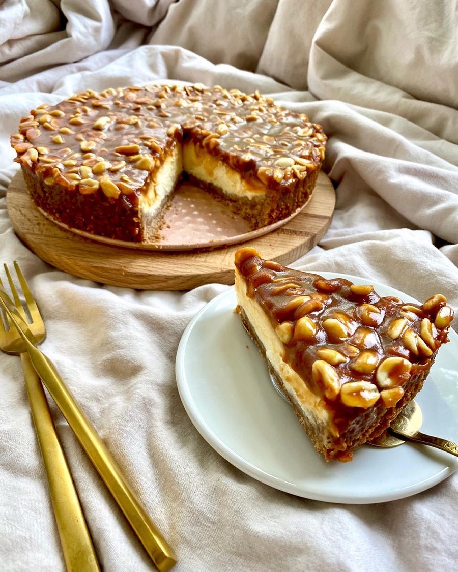 В полученную карамельную массу всыпаем арахис, хорошо перемешиваем и выкладываем на уже застывший слой Сникерса. Разравниваем и оставляем в холодильнике до полного застывания.