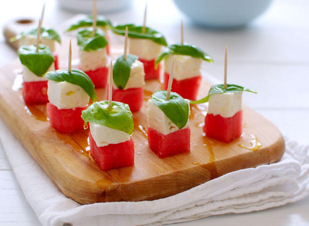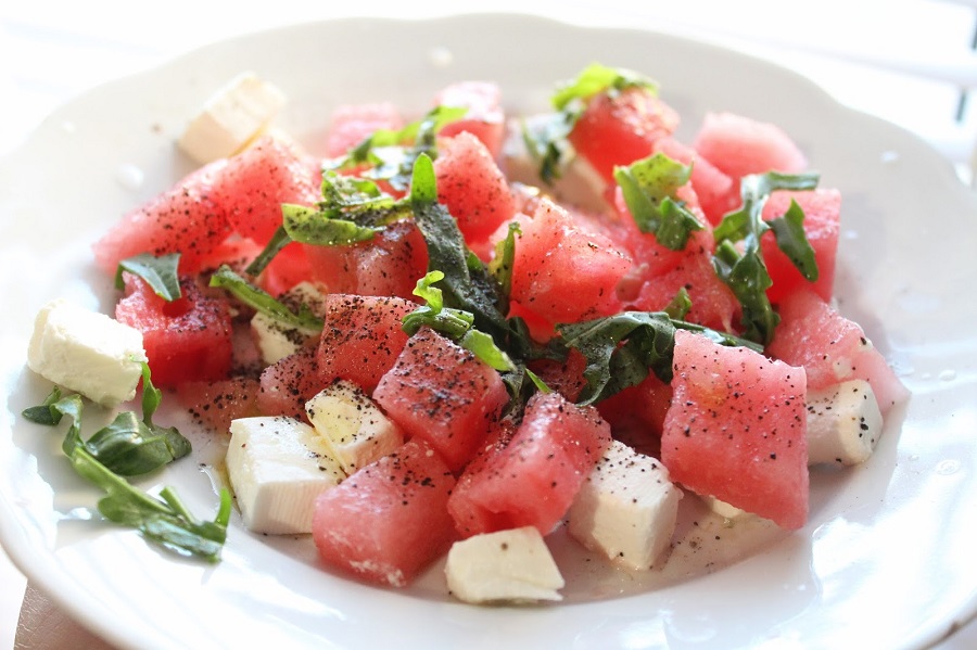 Ингредиенты: арбуз (150 г), фета (40 г), мята (1 веточка), масло оливковое (10 мл), перец черный, сок лайма или лимонный.