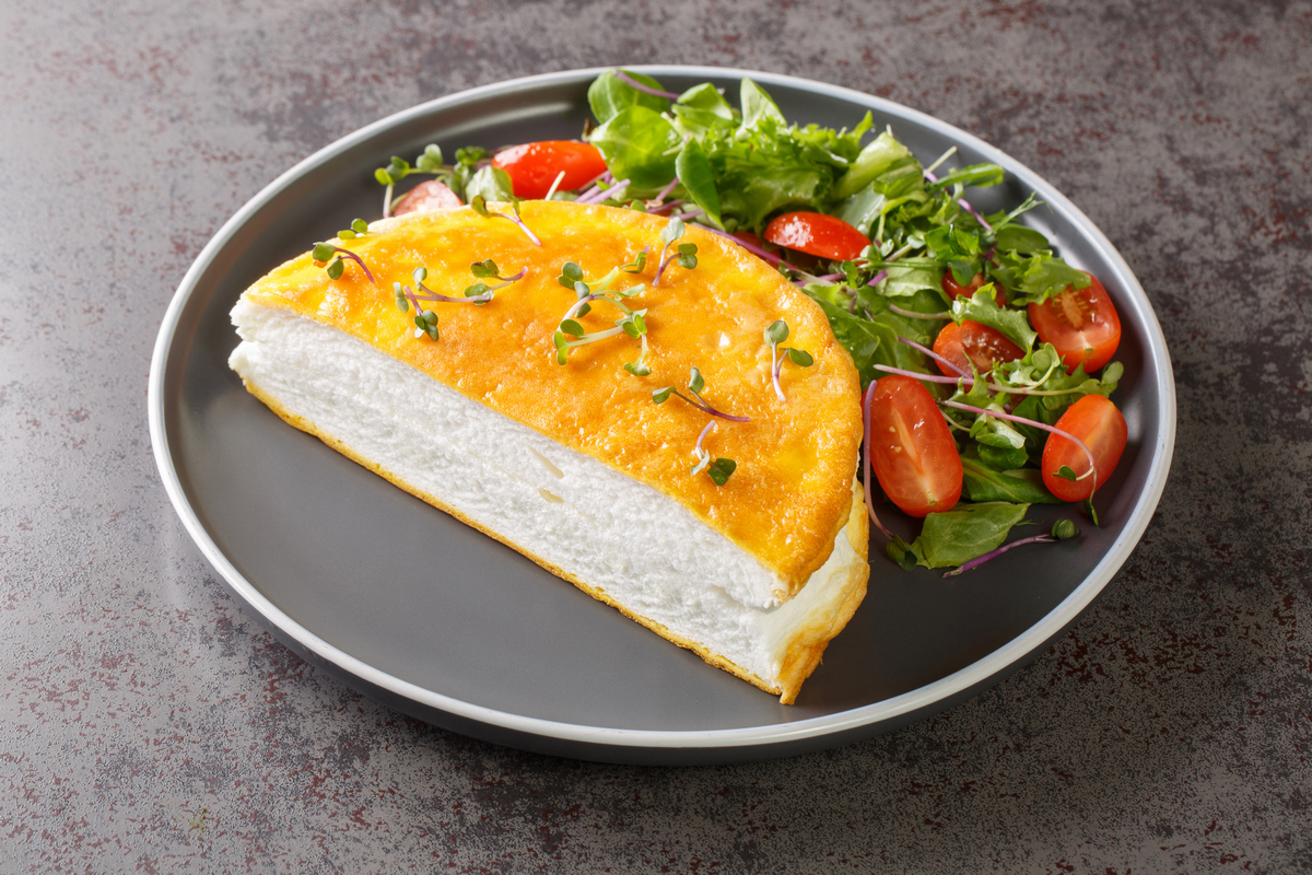 Переложите французский омлет на тарелку, разрежьте пополам, сложите половинки друг на друга белками внутрь. Подавайте в теплом или горячем виде со свежим салатом.