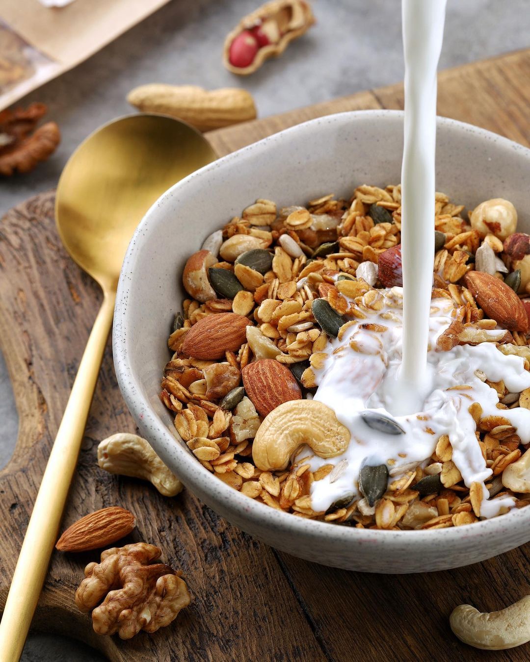 Подаем вкусный сухой завтрак с молоком или йогуртом.