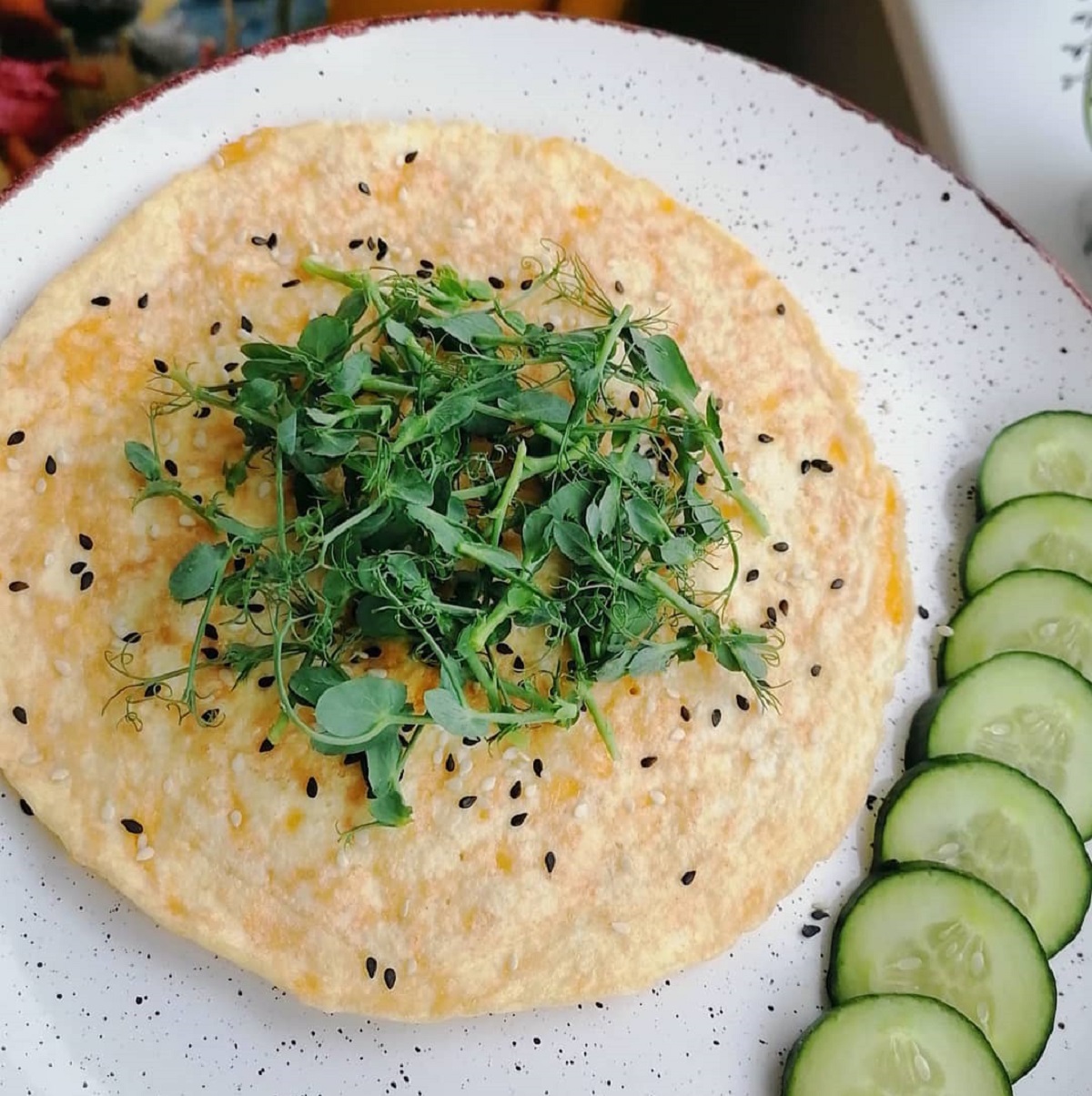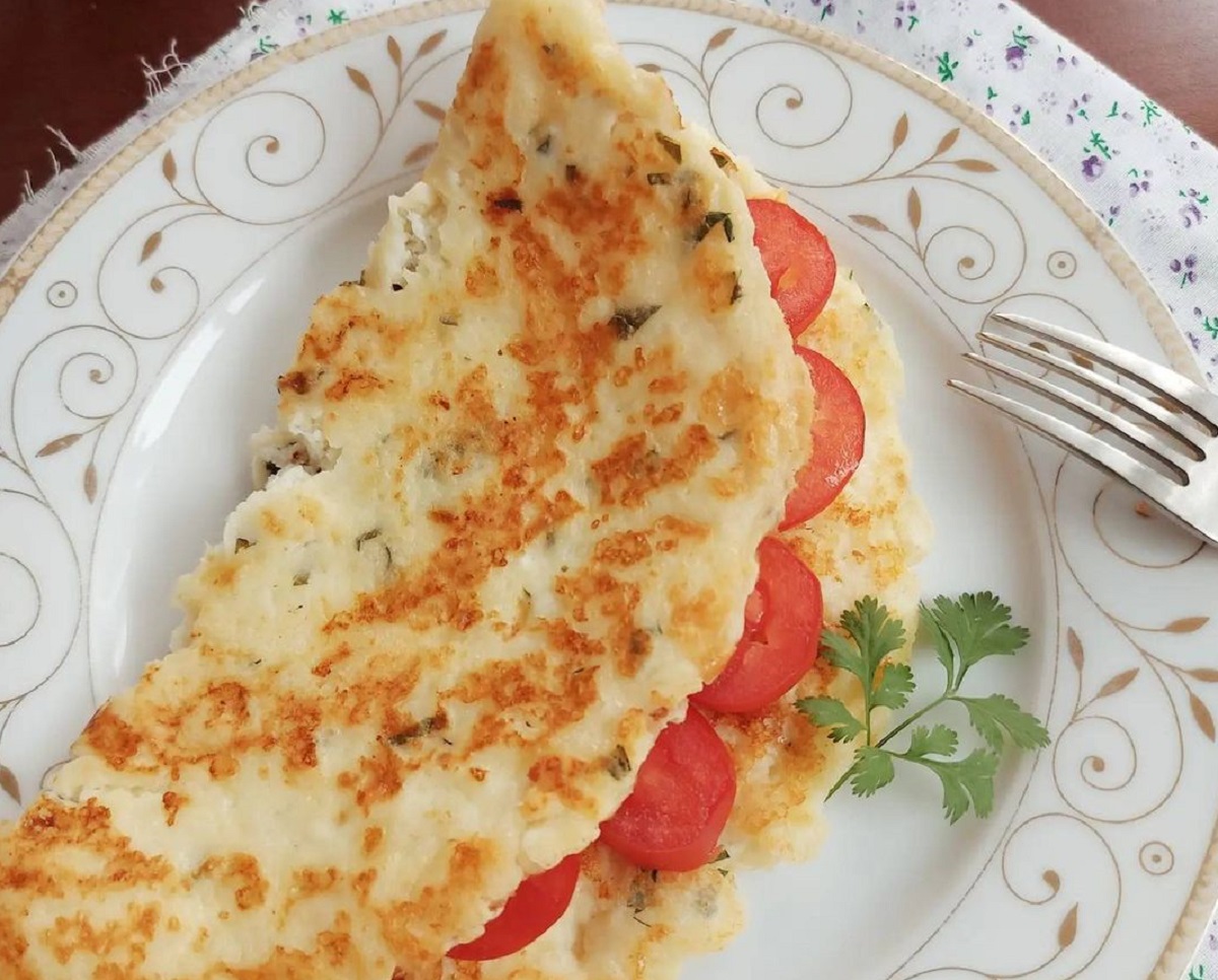 Ингредиенты для блинчика: творог 5% (200 г), твердый сыр (30 г), мука (2,5 ст. л.), яйца (2 шт.), разрыхлитель (0,5 ч. л.), зелень (по вкусу).