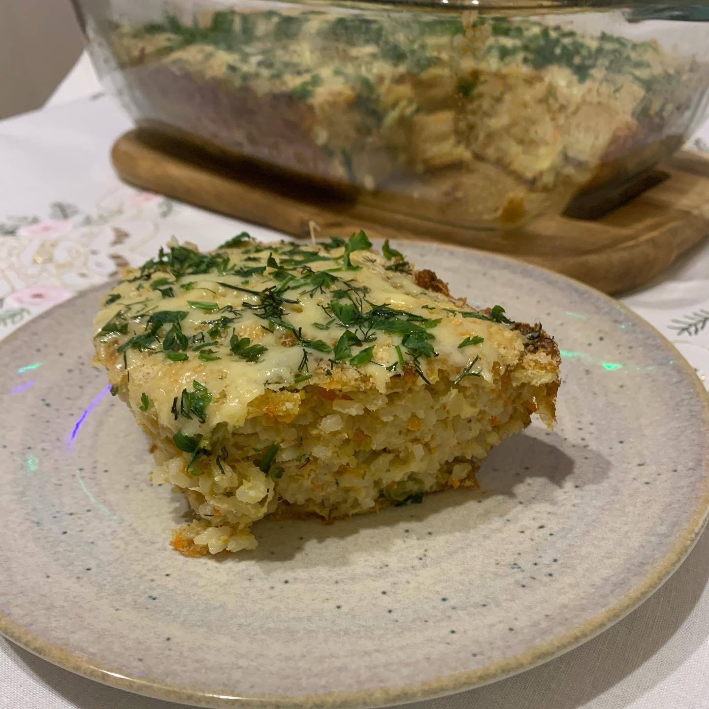 Ингредиенты: 300г риса, 3 яйца, 1 ч л соли, 1 ч л приправы Хмели-сунели, 2 луковицы, 2 морковки, 150 г горошка, 1 банка тунца в масле, измельченные сухари, сливочное масло, сыр, зелень.