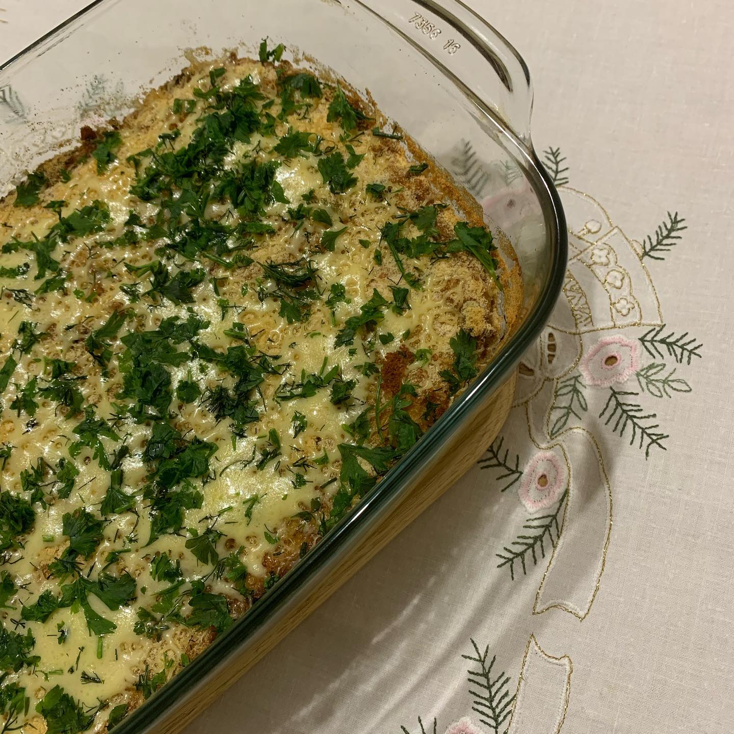 Когда указанное время истекло, достаем запеканку, посыпаем ее сверху сыром и зеленью, отправляем в духовку еще на несколько минут. После этого даем еде немного остыть и начинаем пробовать. Приятного аппетита!