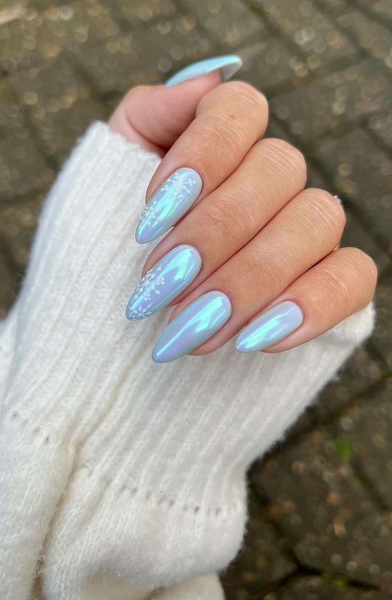 Ногти цвета металлик, или, как их еще называют, глазированные ногти – самый большой тренд 2023 года. Серебро, бронза, металлик – хромированные ногти любого цвета обязательно привлекут внимание как в повседневной жизни, так и на вечеринке в честь Нового года. Для того, чтобы сделать такой эффект, следует покрыть ногти гель-лаком, а сверху нанести специальную пудру или, как ее еще называют, втирку. Дополнить дизайн можно снежинками или любой другой новогодней атрибутикой.