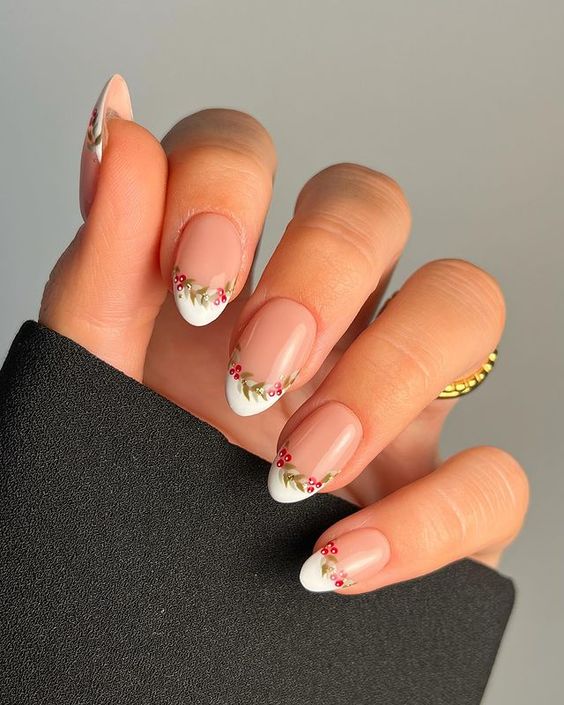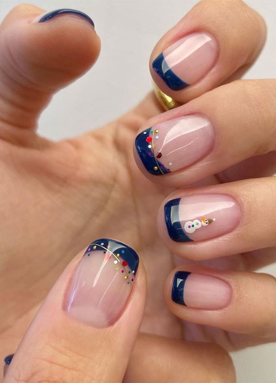 Френч в новогоднем стиле – беспроигрышный вариант для ногтей любой длины и формы. Как известно, классический французский маникюр создают следующим образом: ногтевую пластину покрывают неярким бежевым или пастельно-розовым тоном лака, а на кончик ногтя по форме полумесяца наносят белый цвет. Для праздничного нейл-арт можно подобрать оригинальный оттенок кончика, украсить его блестками или тематическим узором.