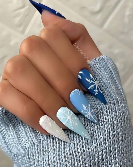 Также можно сделать оригинальный градиентный или, как его еще назфывают, маникюр омбре – то есть растяжку цвета от одного ногтя к другому. То есть самый темный оттенок наносят на ноготь на большом пальце, а самый светлый – на мизинец. Направление может быть и другим – от мизинца к большому пальцу. Дополнить такой нейл-арт можно объемными изображениями снежинок или надписями.