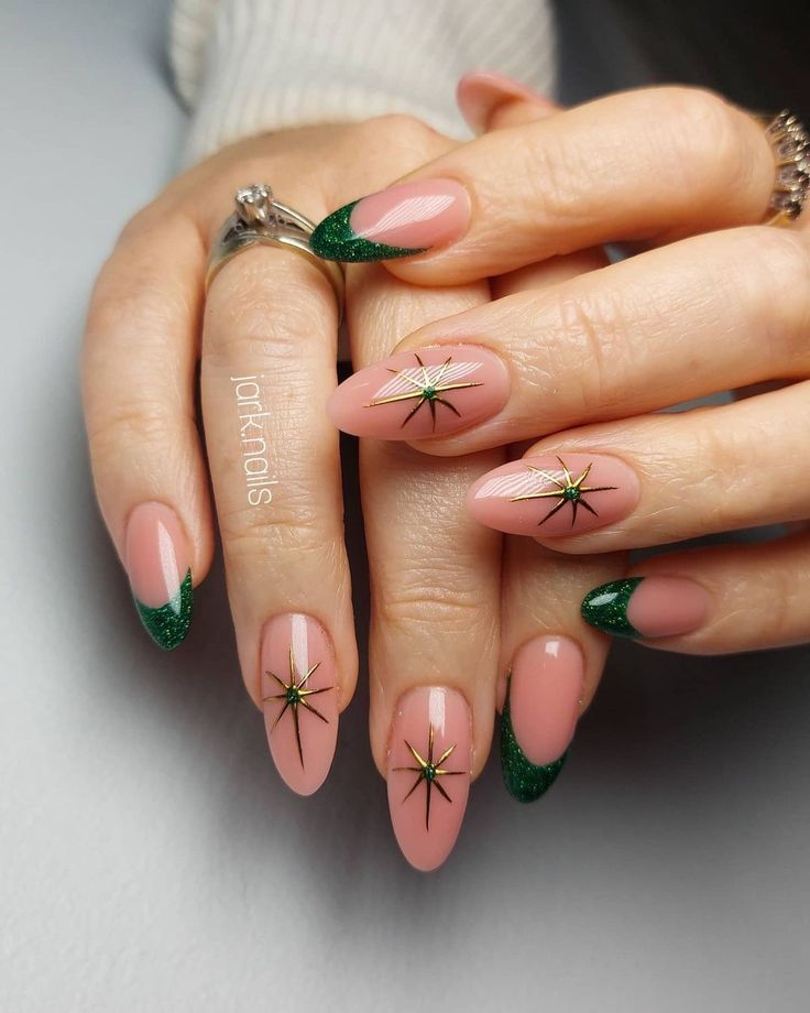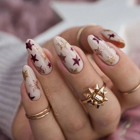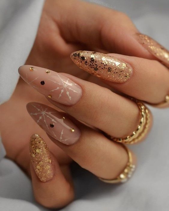 Еще один вариант маникюра, который подойдет для празднования Рождества или Нового года, – золотистое покрытие с шиммерными блестками, разными узорами и, конечно же, снежинки. Их можно нарисовать от руки или же сделать с помощью стемпинга – то есть перенесения на ноготь при помощи штампа рисунка с трафарета.