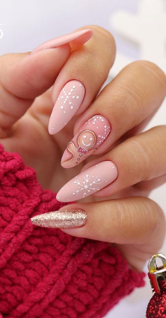 Также можно сделать красивый новогодний маникюр с элементами атрибутики этого праздника: изображением гирлянды, снеговика, снежинок, звезды, ели или еловой ветка, банта на подарке, пряничного человечка.