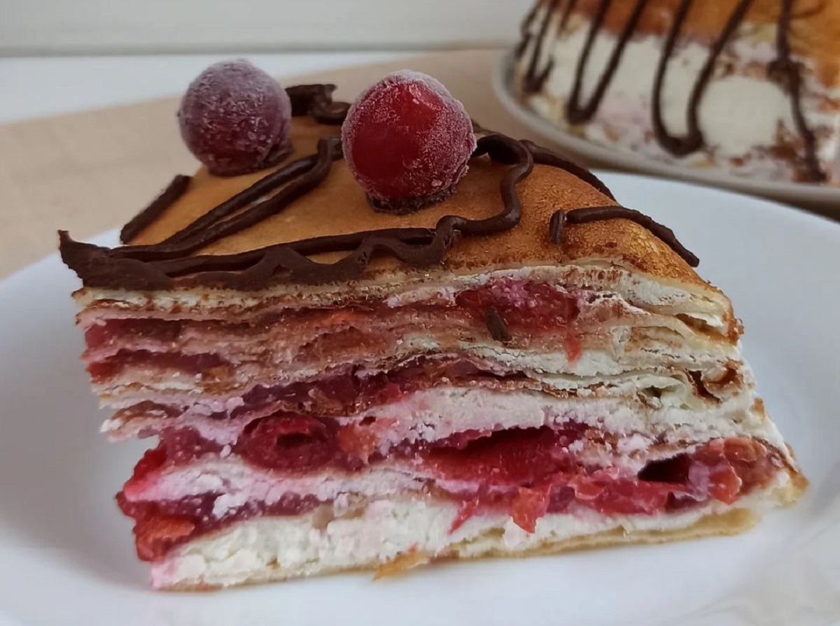 В 2023 году веселый народный праздник Масленица, который символизирует проводы зимы и встречу весны, начинается 20 февраля и заканчивается Прощеным воскресеньем (26 февраля). На протяжении этой недели принято печь блины с разными начинками. И если вы уже делали их с красной рыбой и сливочным сыром, на этот раз удивите свою семью блинным тортом со сметанным кремом и вишневой начинкой. theLime делится простым рецептом.