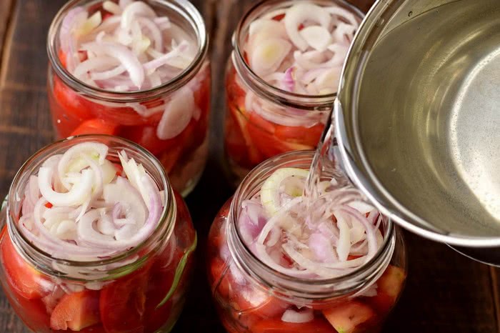 Ингредиенты на 7 банок по 0,5 л: помидоры (2 кг), лук (0,5 кг).