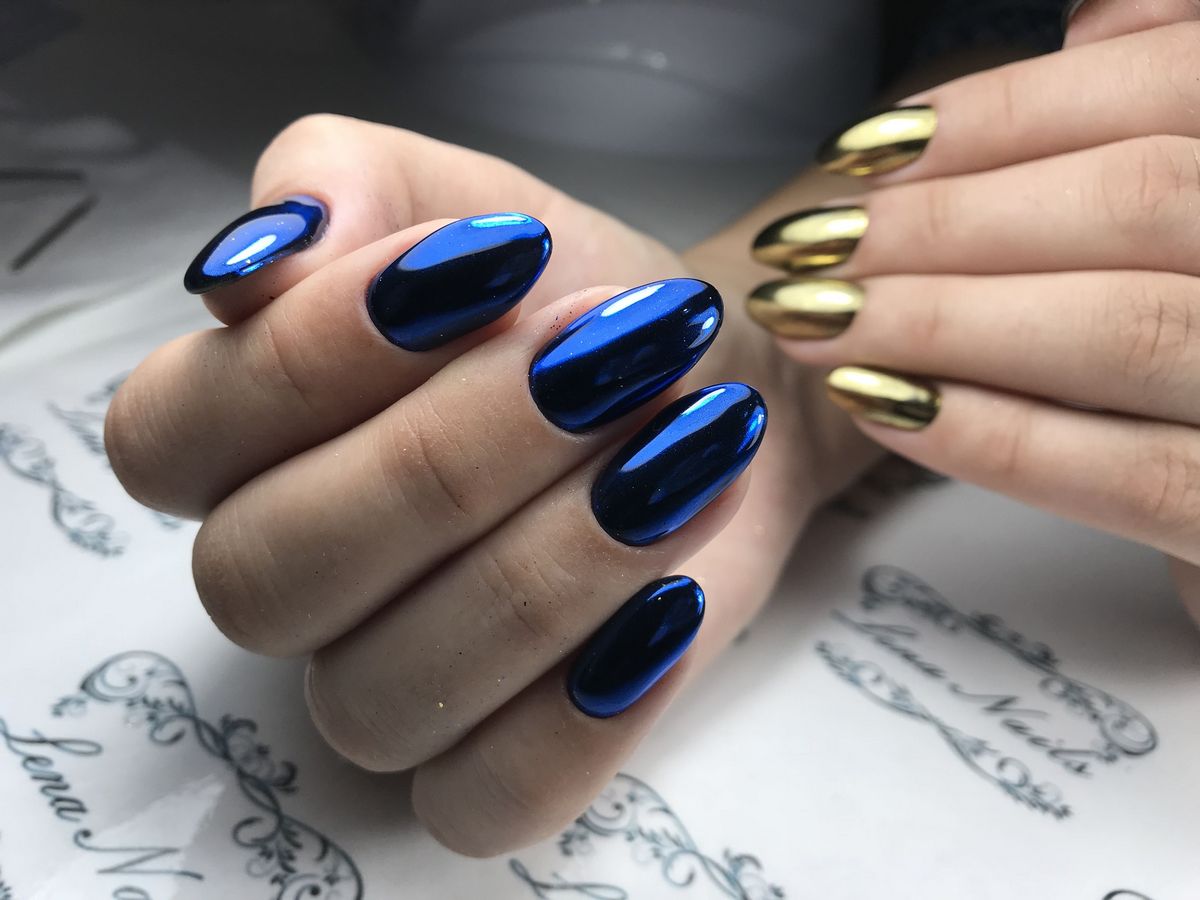 Зеркальные ногти, или хромированные ногти - популярная тенденция в нейл-арте, которая придает маникюру зеркально-металлический эффект. Если хотите оригинальные ногти, выбирайте маникюр с втиркой в синих тонах.