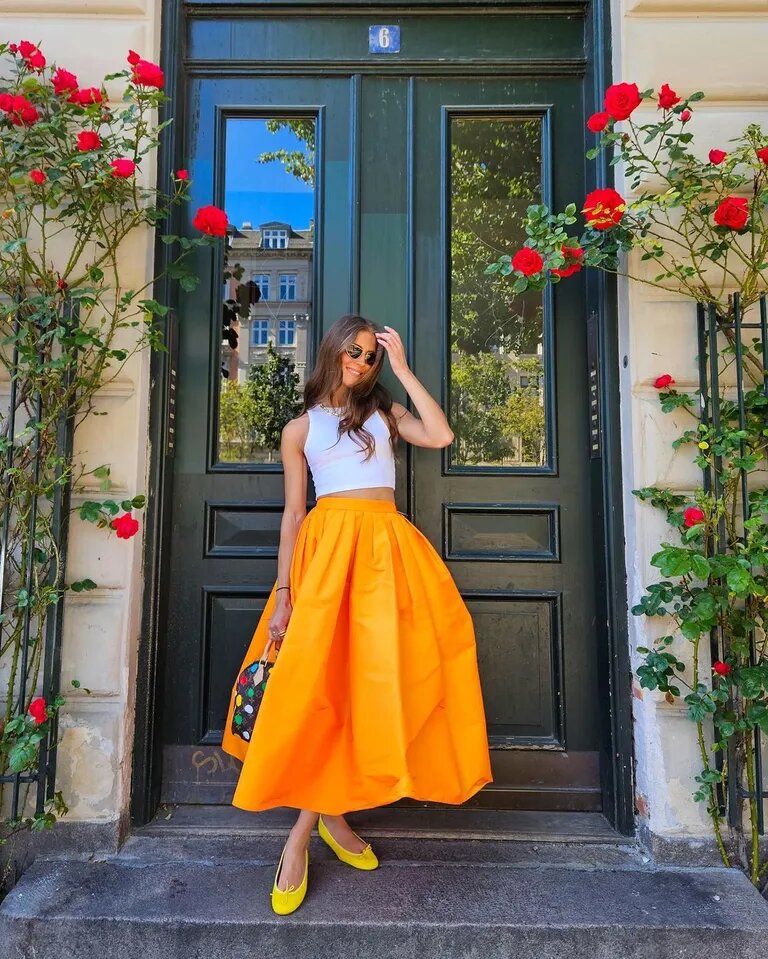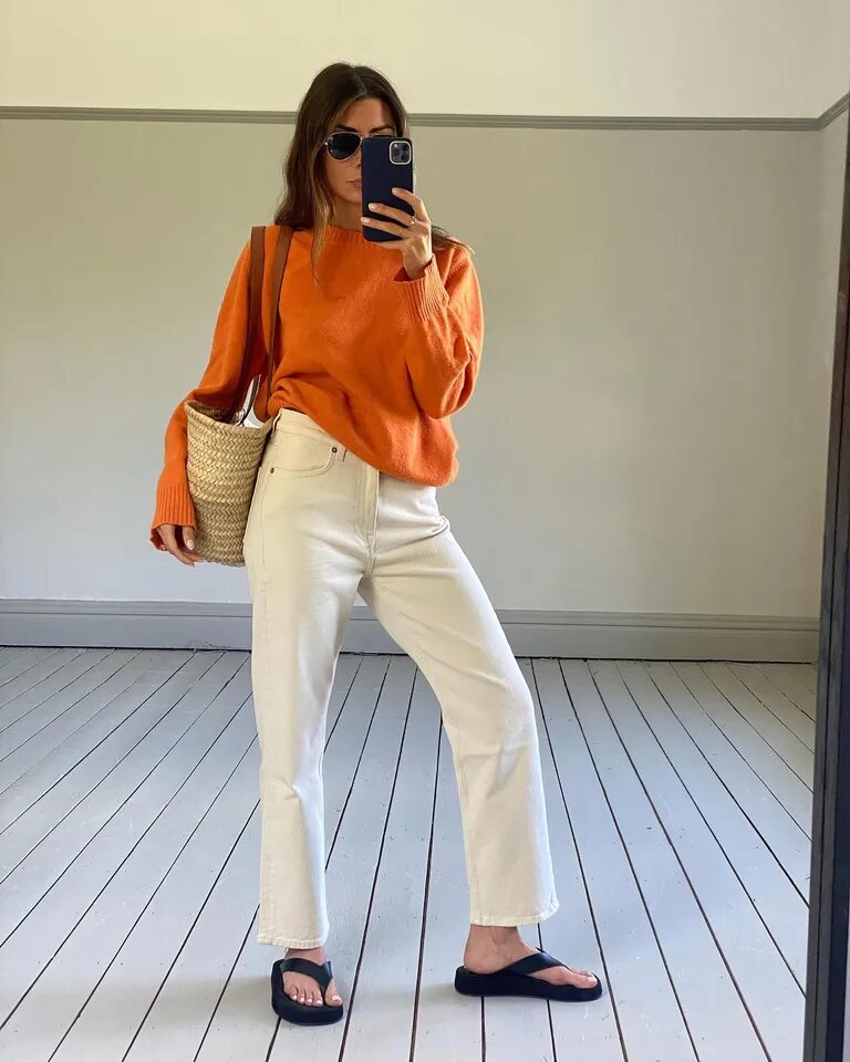 Яркие оранжевые тона сейчас доминируют на рынке, и нетрудно понять, почему. От глубоких оттенков до сочных, граничащих с неоновыми, оранжевых цветов, которые так хотят видеть в своих нарядах многие модницы. При одном только взгляде на эти наряды зима кажется очень далеким воспоминанием. Стилисты рекомендуют нейтрализовать мандариновый оттенок, сочетая его с однотонными белыми вещами.