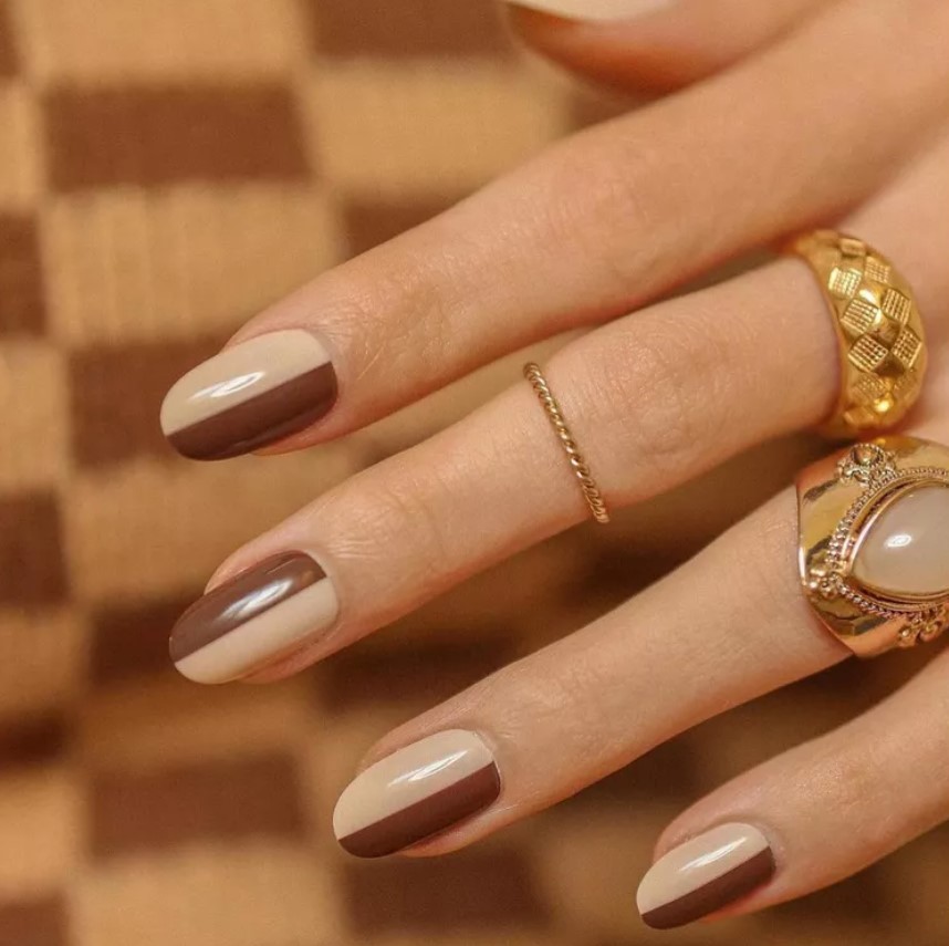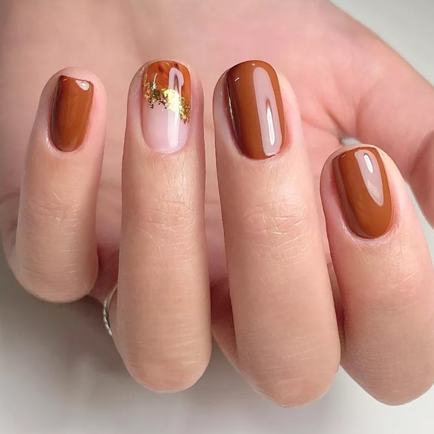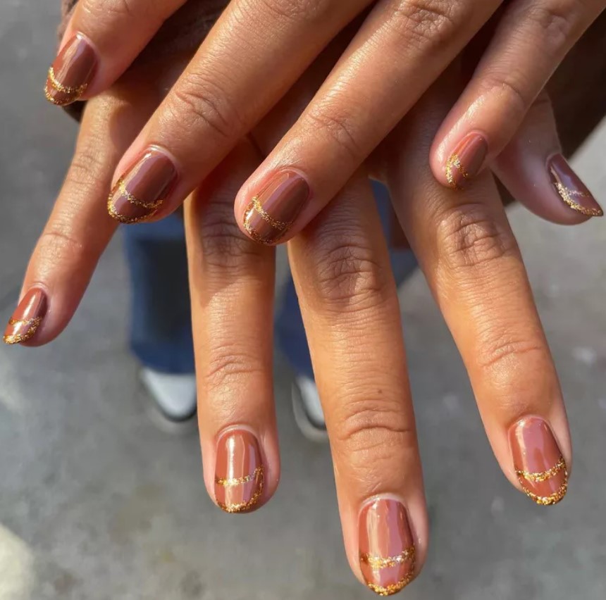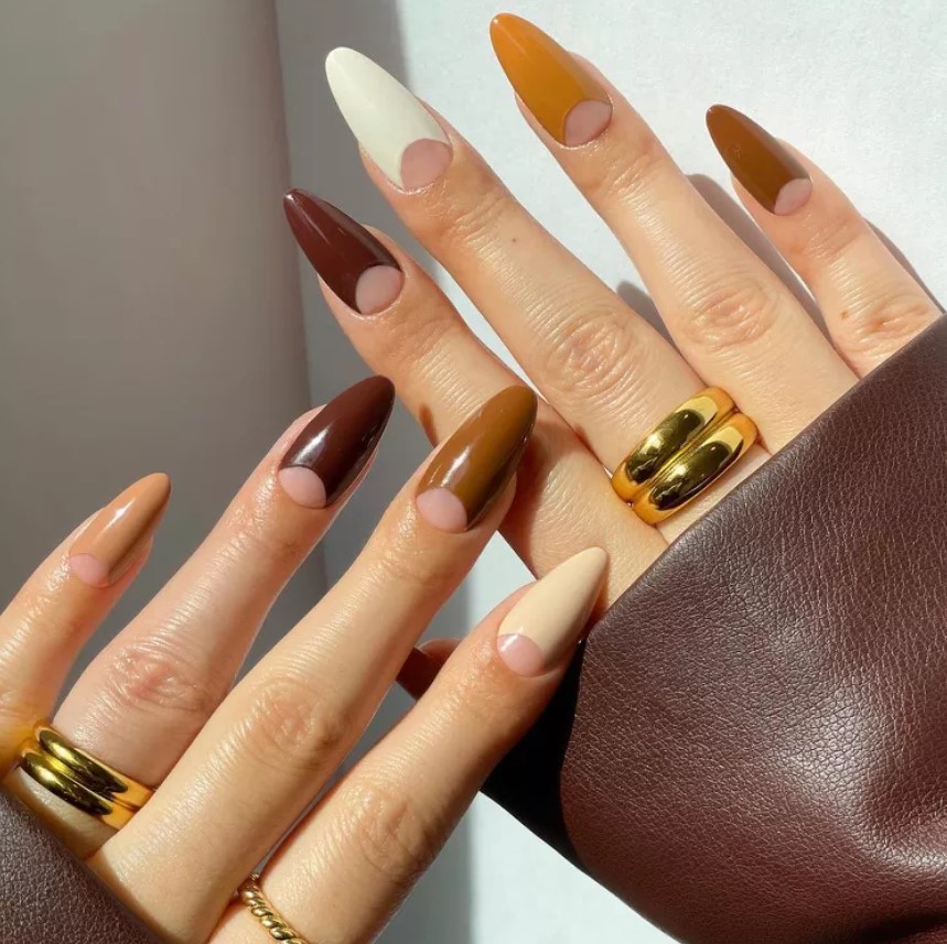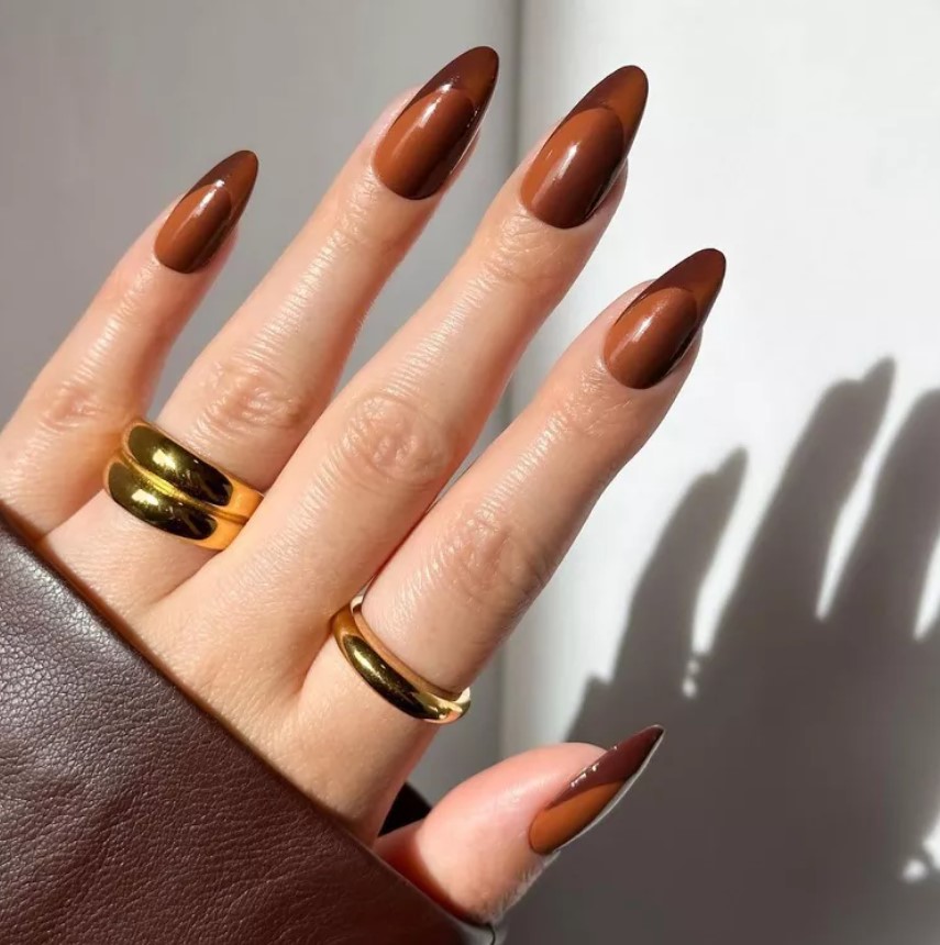 Это техника нанесения, при которой лунка выделяется другим цветом или остается прозрачной. Такой вариант позволит вам соединить не только шоколадный цвет, но и другие: например, белый и горчичный.