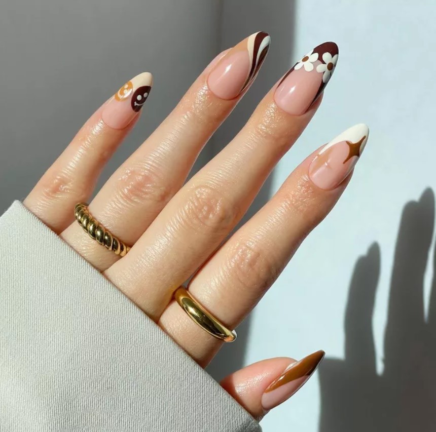 Если вы хотите попробовать сразу много коричневых оттенков, сделайте покрытие в таком стиле. Особенно удачно мультяшный маникюр смотрится на длинных и средней длины ногтях.