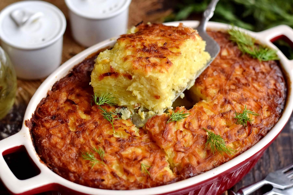 Включаем духовку на максимум и подрумяниваем кугель в течение 2-3 минут. Нарезаем большими кусками и подаем сразу же, посыпав свежей зеленью.