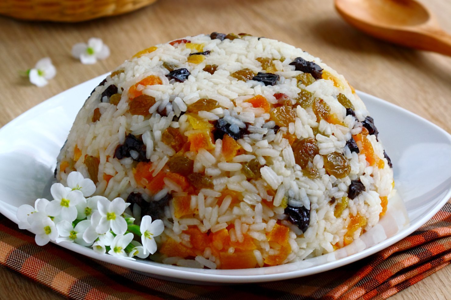 Ингредиенты: рис (1,5 стакана), тыква (500 г), яблоко (2 шт.), айва (1-2 шт.), изюм (0,5 стакана), сливочное масло (150 г), мед (по вкусу).