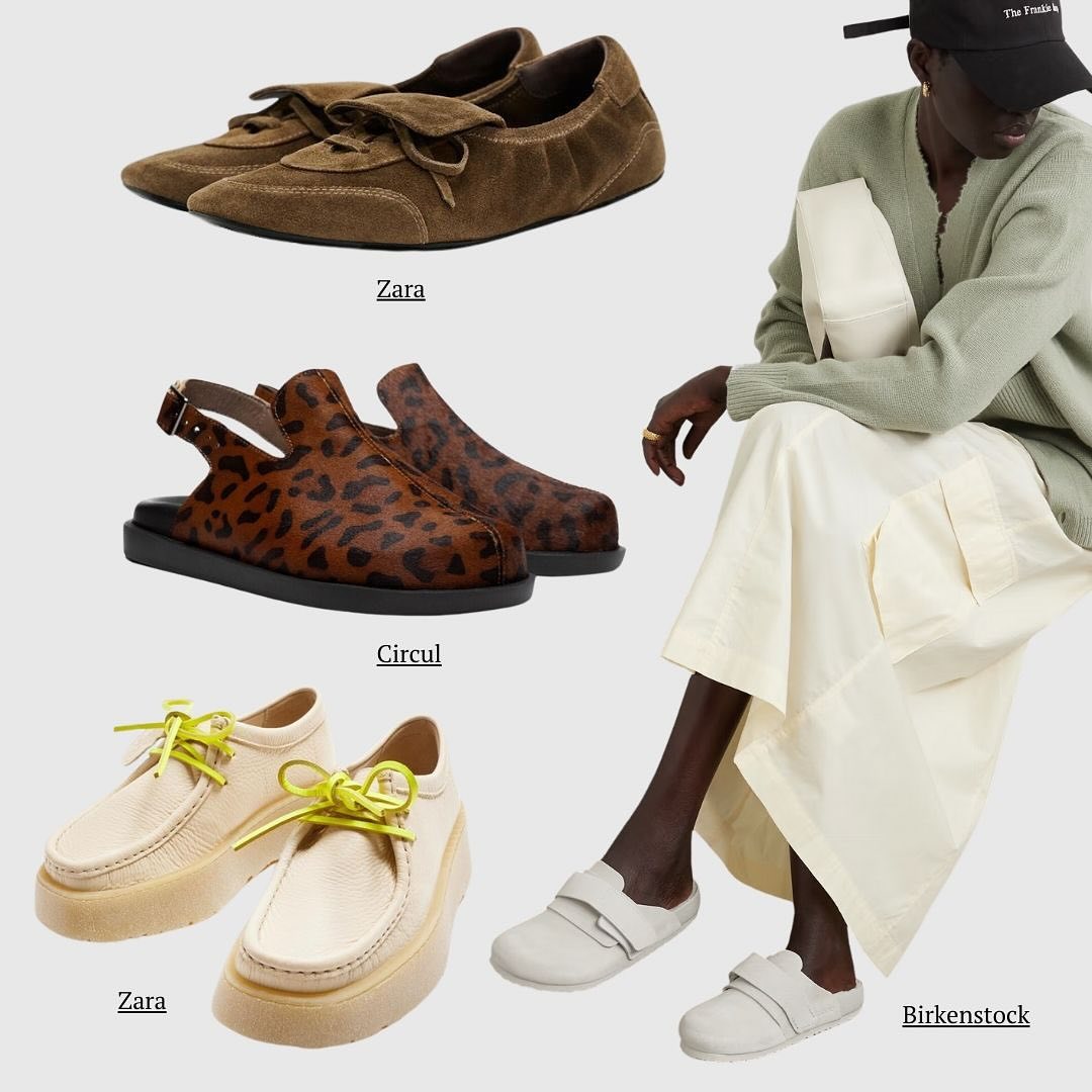 Еще один вариант на весну-2024 – удобная обувь без каблуков. Это могут быть замшевые мокасины, сандалии с леопардовым принтом или же обувь на платформе.