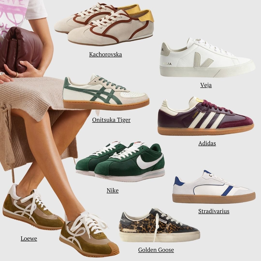 Стилист также рекомендует обратить внимание на разные варианты женских кроссовок: это могут быть ретро-модели на массивной подошве или, как их еще называют папины кроссовки, трендовые кроссовки Onitsuka Tiger, а также яркие или с животными принтами, которые сейчас на пике популярности.