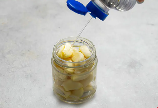 Чтобы продлить срок потребления чеснока, храните его в белом уксусе. Очищенные зубчики поместите в стеклянную банку с плотной крышкой и залейте их белым уксусом, чтобы они хорошо покрылись.