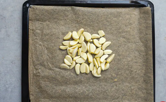 Отделите головки, затем аккуратно очистите зубчики от кожуры. Нарежьте каждый зубчик тонкими полосками и выложите их в один слой на противень, застеленный бумагой для выпекания на расстоянии друг от друга.