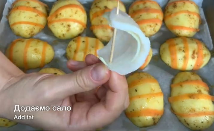 На картошку вначале нужно выложить морковь. Сверху сделать паруса, вооружившись зубочисткой, кусочком лука и сала. Вставить заготовку в картофелину.