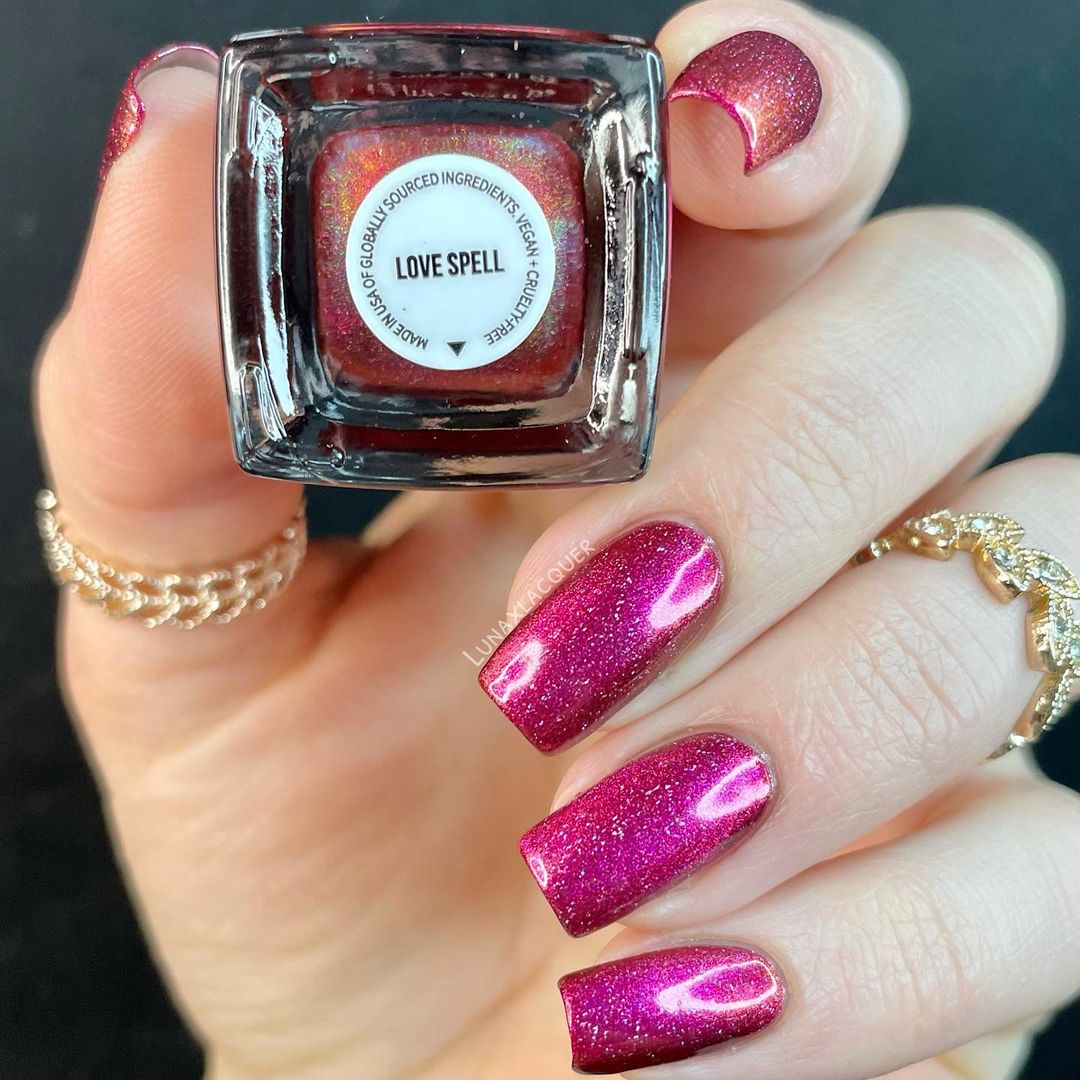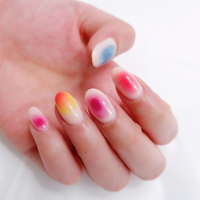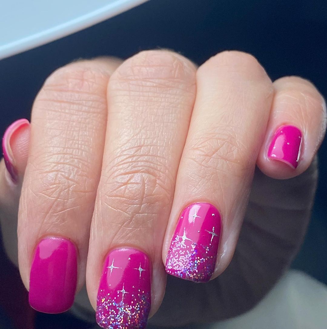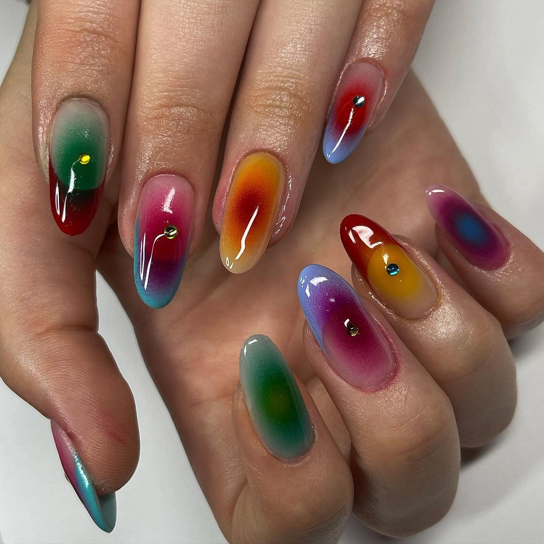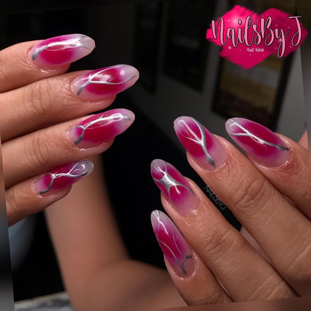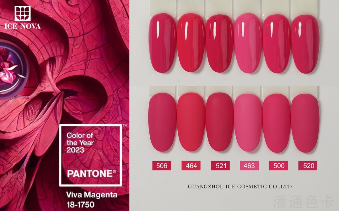 Большим трендом в 2023 году будет маникюр с аурой - яркие круги на ногтях, которые плавно переходят в контрастные или более светлые оттенки. В такой дизайн очень легко вписать цвет Viva Magenta, оттенки красного и розового.