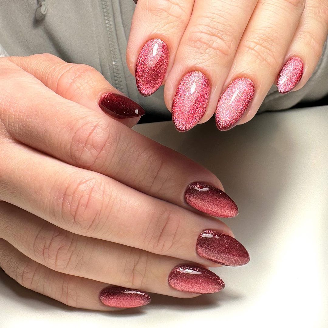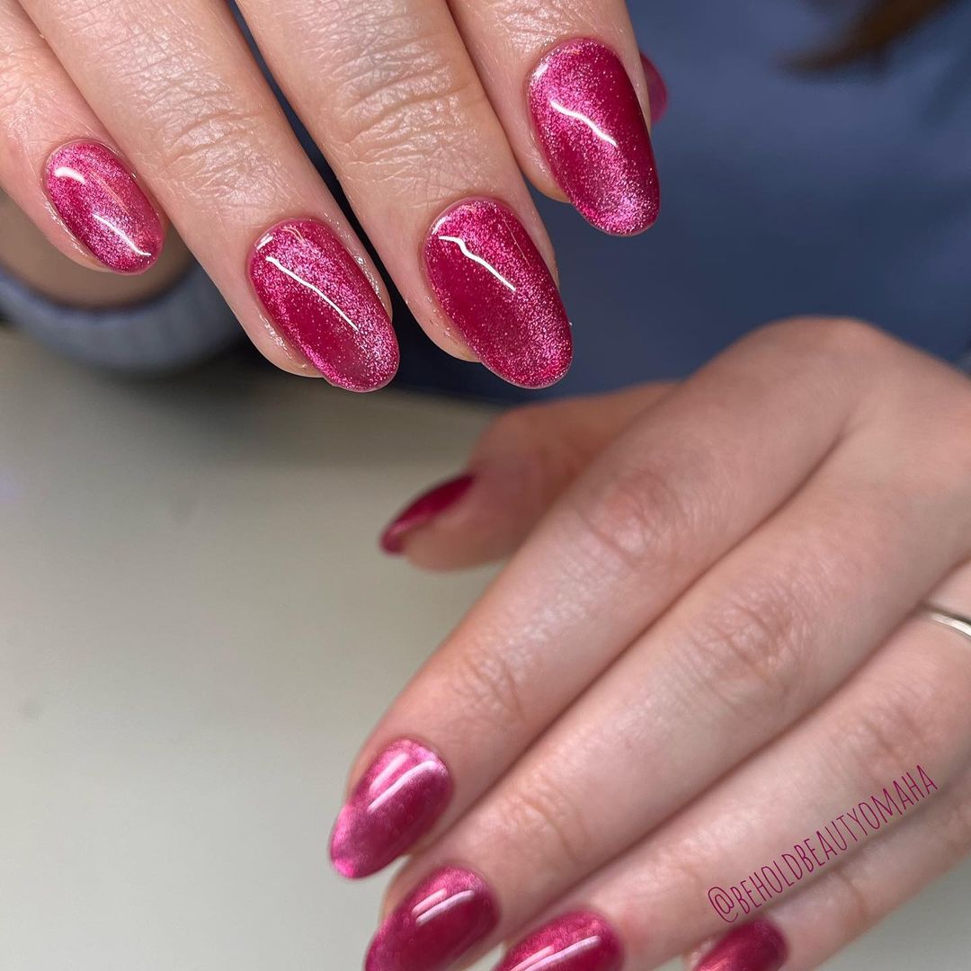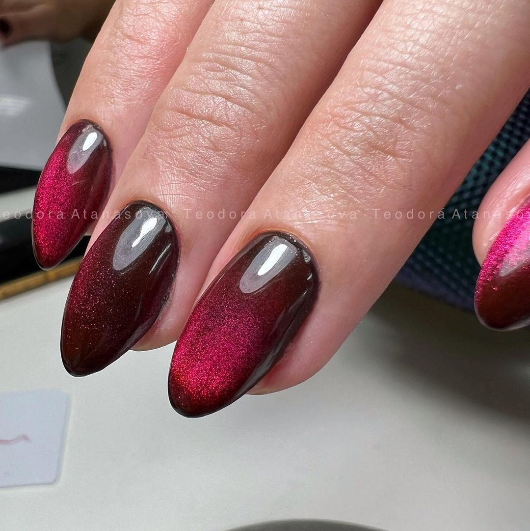 Еще одна вариация такого дизайна - маникюр кошачий глаз, который многие любят за глубину и красивые переливы цвета.