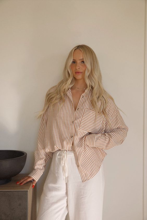 Полосатая рубашка на пуговицах из плотной ткани была неотъемлемой частью любого гардероба 90-х. Эта базовая вещь универсальна и подойдет практически для любого случая. Наденьте ее с льняными брюками или джинсами для городской прогулки, поверх шорт или купальника для отдыха на пляже.