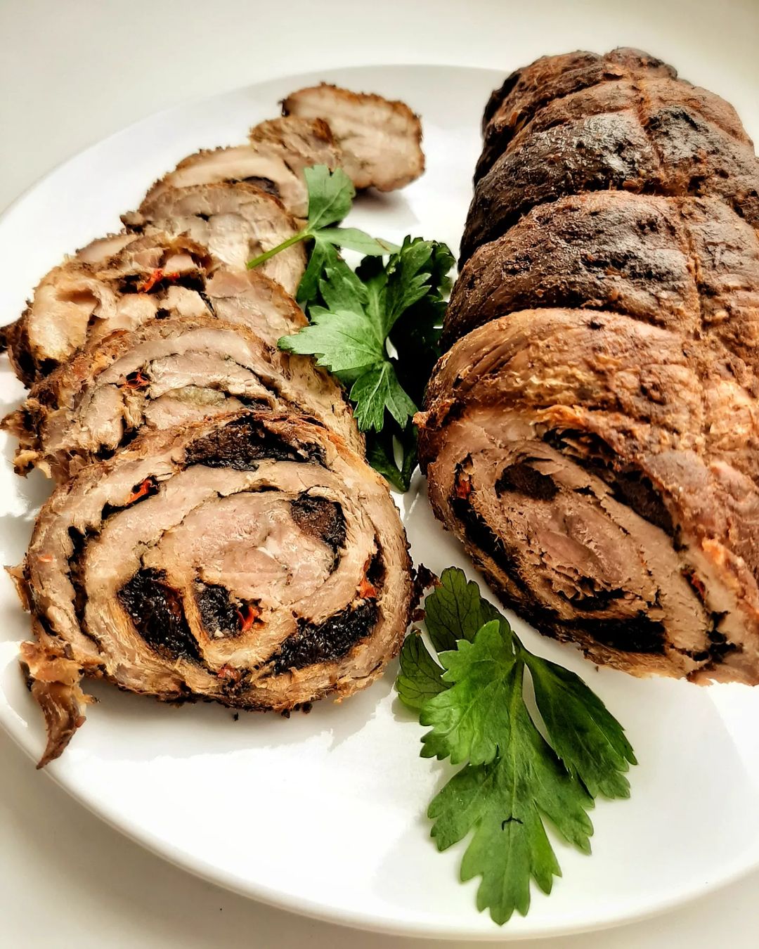 Ингредиенты: тонкий кусок свинины, чернослив, красный салатный перец, чеснок, петрушка, соль, черный молотый перец, молотый лавровый лист, молотый кориандр, молотый красный перец.