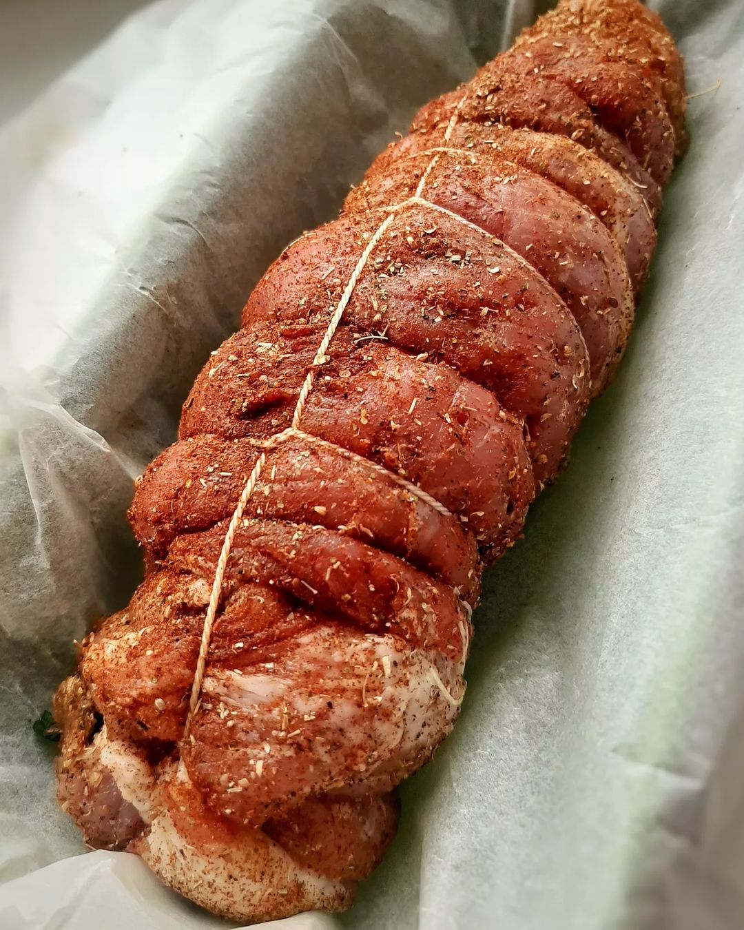 Сворачиваем мясо в рулет. Смазываем сверху растительным маслом и натираем специями. Перевязываем нитью, чтобы рулет не распался. Оставляем его мариноваться на 30 минут.