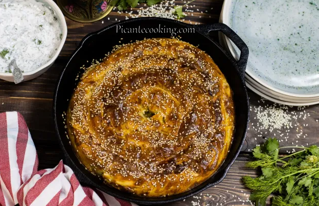 Особенностями этого известного турецкого пирога являются хрустящее тесто, сочная начинка из мяса и овощей, ароматные пряности и румяный сезам сверху.