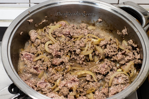 2. Добавьте мясо, посолите по вкусу и тушите, помешивая, пока оно не изменит цвет.
