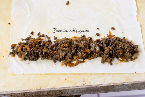 6. Каждый лист теста смажьте тонким слоем сливочного масла. Далее выложите полоску начинки на каждый лист по ширине (так же сделайте с каждым листом теста).