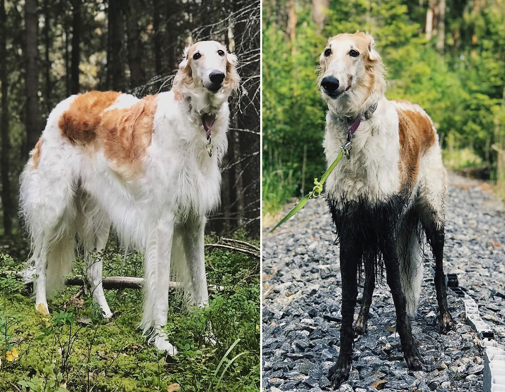 Русская борзая Койра пришла в лес, чтобы подобрать себе элегантные черные брюки. Для смокинга, увы, не нашлось достаточно глубокой лужи.