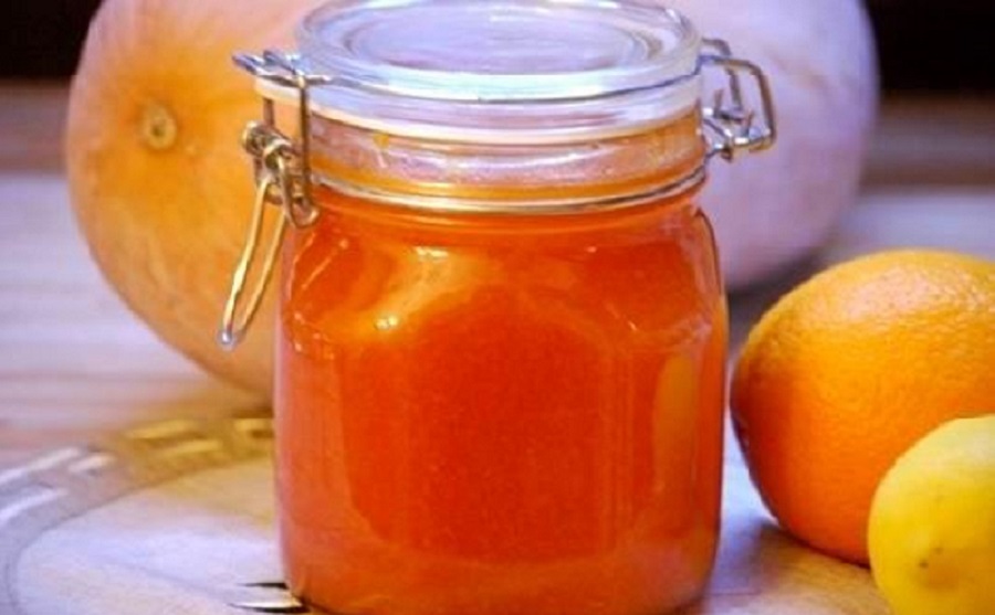 В глубокую кастрюлю нужно выложить тыкву и цитрусовые вместе с цедрой, добавив 1 кг сахара. Варить на небольшом огне в течение 30 минут, а когда все закипит, следует регулярно помешивать массу. В конце сваренные ингредиенты нужно перебить блендером до однородности и выложить варенье в стерилизованные банки, закрыть их стерилизованными крышками.
