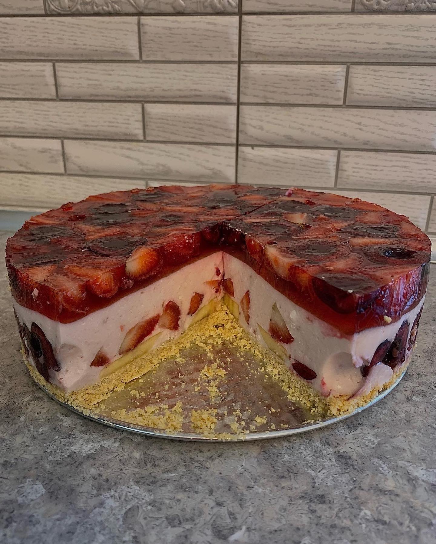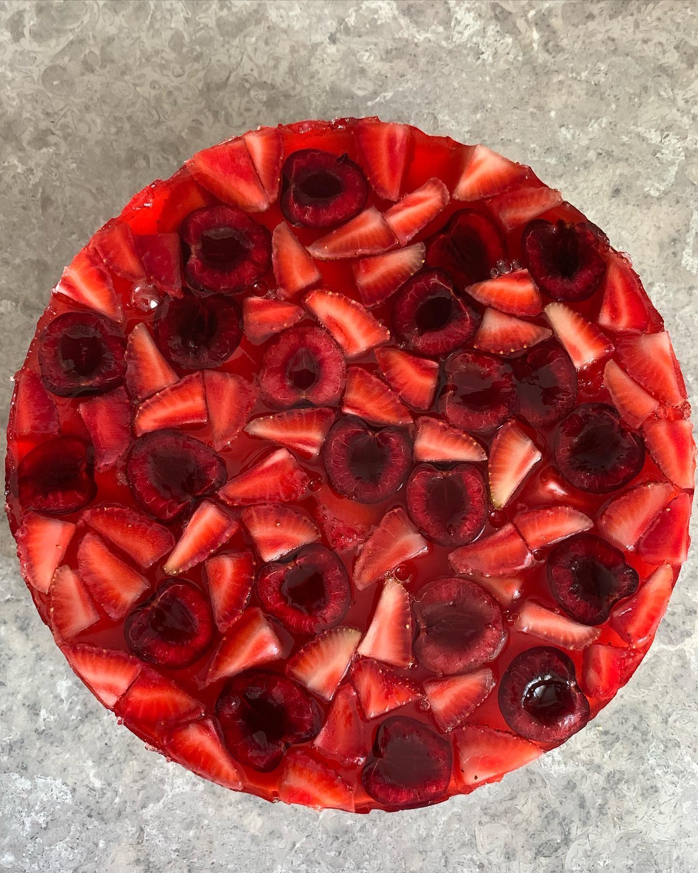 За это время нарезаем фрукты и выкладываем их на начинку торта, осторожно заливаем желе, чтобы фрукты держались так, как их выкладывали (при большом количестве желе, они все равно двигаются). Ставим десерт в холодильник до полного застывания желе.