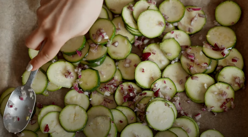 "Для начала нам нужно нарезать лук – половину красной луковицы нарезаем мелкими кубиками. Далее два небольших кабачка или цуккини нарезаем тоненькими кольцами толщиной примерно 2 мм.