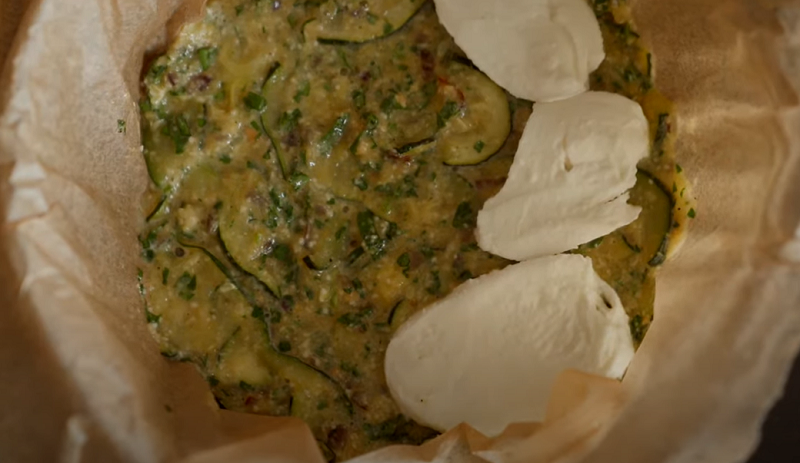 Нарезаем тоненькими ломтиками сыр моцарелла – нам хватит 125 г. В застеленную пергаментом форму мы выкладываем половину подготовленных кабачков и накрываем их кусочками моцареллы. Сыр, кстати, можно брать других видов – очень интересен вкус подкопченного сыра. И уже на слой моцареллы выкладываем вторую половину кабачков", – добавила блогер.
