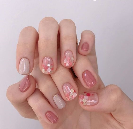 Японский маникюр должен быть выполнен или в одной цветовой гамме, или с использованием нескольких цветов, которые гармонично дополняют друг друга.