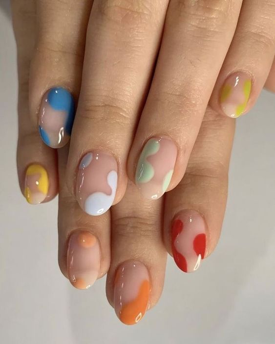 Как вариант – можно сделать трендовый маникюр с волнистыми линиями, при этом каждый ноготь покрыть разным оттенком.